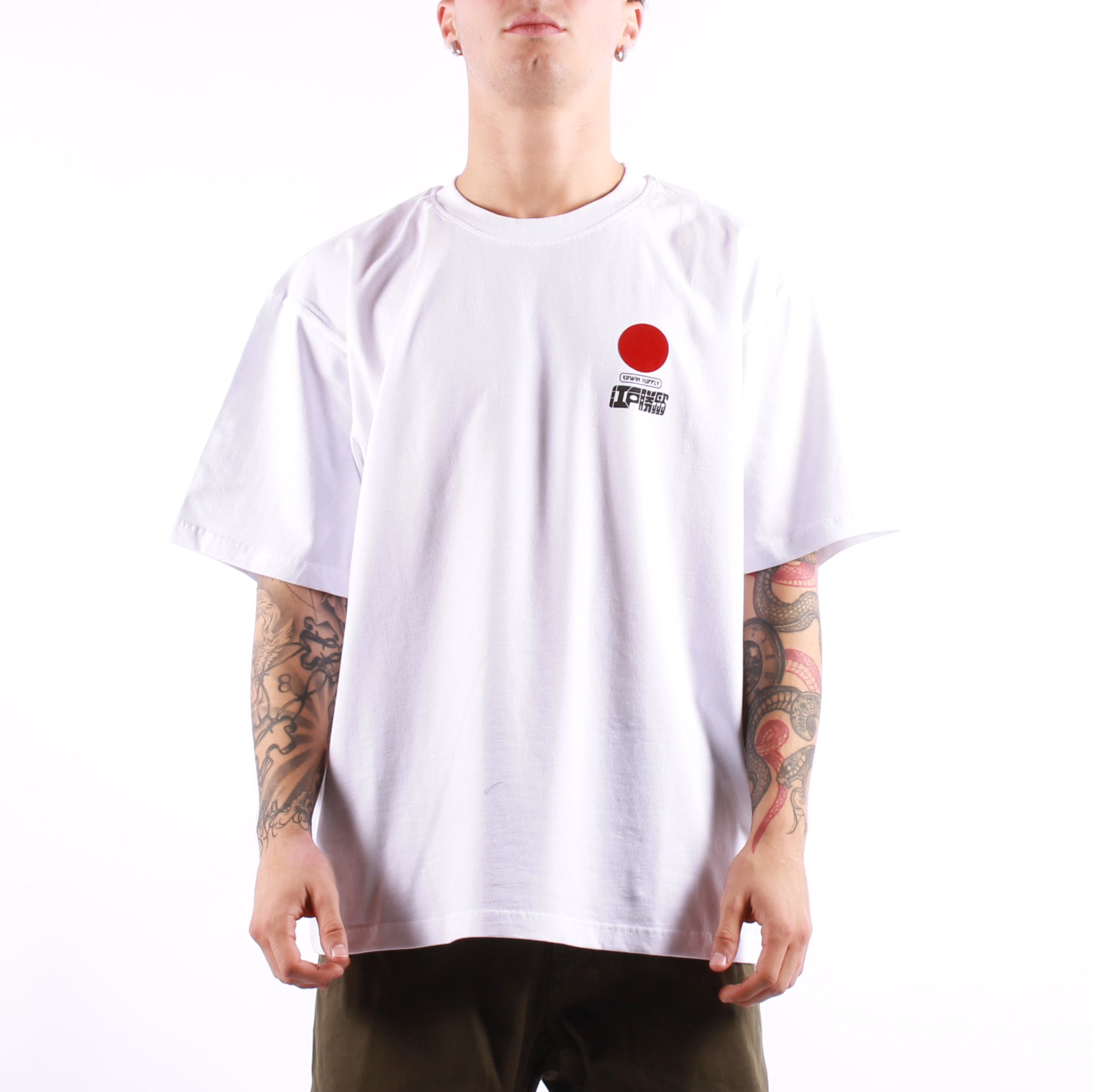 La EDWIN Sun T-Shirt è realizzata in jersey singolo da 160 g/m² in puro cotone e si distingue per la vestibilità oversize che dona un look rilassato e contemporaneo. Il design è arricchito da una stampa grafica sul petto e rifinito con colletto a coste per maggiore struttura e durata. Prodotta in Marocco, unisce comfort e stile in un capo essenziale del guardaroba casual.