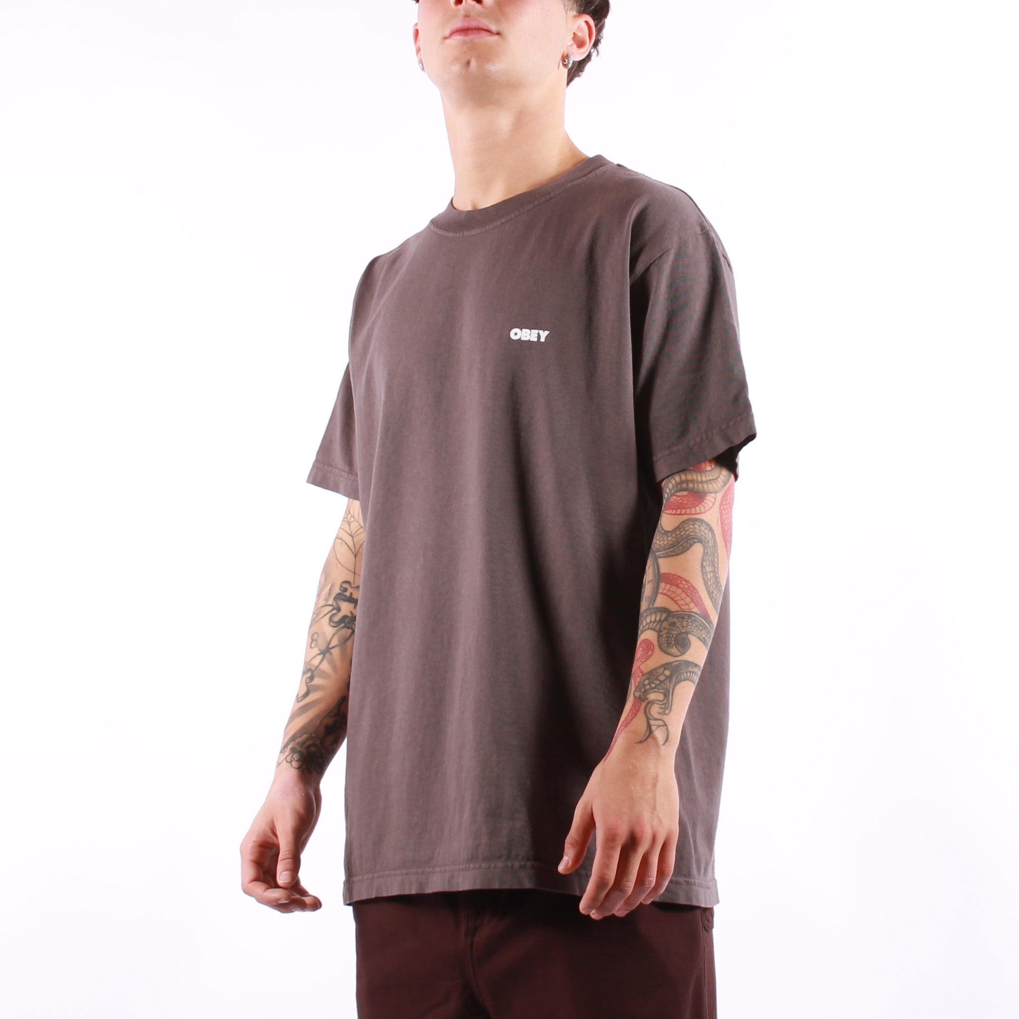 T-shirt Obey in cotone pesante da 8oz, caratterizzata da una vestibilità regolare e un lavaggio pigmentato che dona un aspetto unico e vissuto. Presenta una grafica stampata sul fronte e sul retro, per uno stile distintivo e autentico firmato Obey.