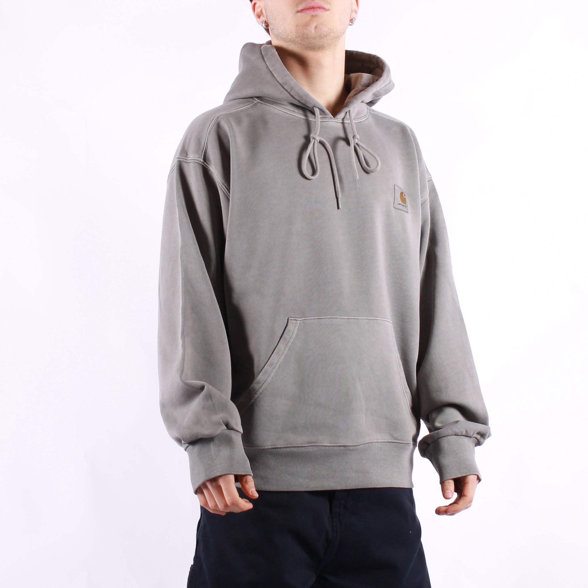 La Hooded Nelson Sweatshirt è realizzata in pesante jersey di cotone non spazzolato. La camicia è stata tinta in capo per un colore più intenso. È dotata di tasca a marsupio e cappuccio trapuntato regolabile con imbottitura. Il vistoso taglio “a palloncino” la rende più ampia e comoda, ed è contraddistinta da spalle scese e polsini a coste. Rifinitura con la classica etichetta in tessuto Carhartt WIP sul lato sinistro del petto.