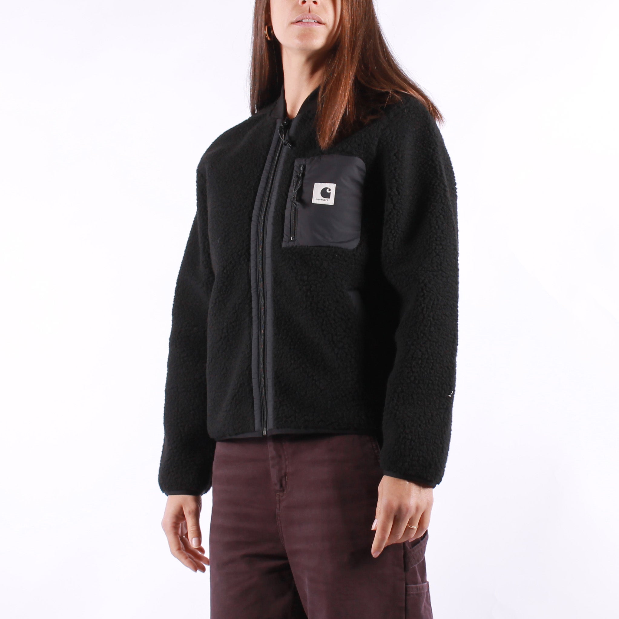 La W’ Janet Liner è realizzata in pile pesante 10,03 once e presenta dettagli in taffetà di nylon a contrasto e un solo taschino sul petto con etichetta Carhartt WIP. È caratterizzata da fodera in taffetà di nylon e da collo in maglia a coste.