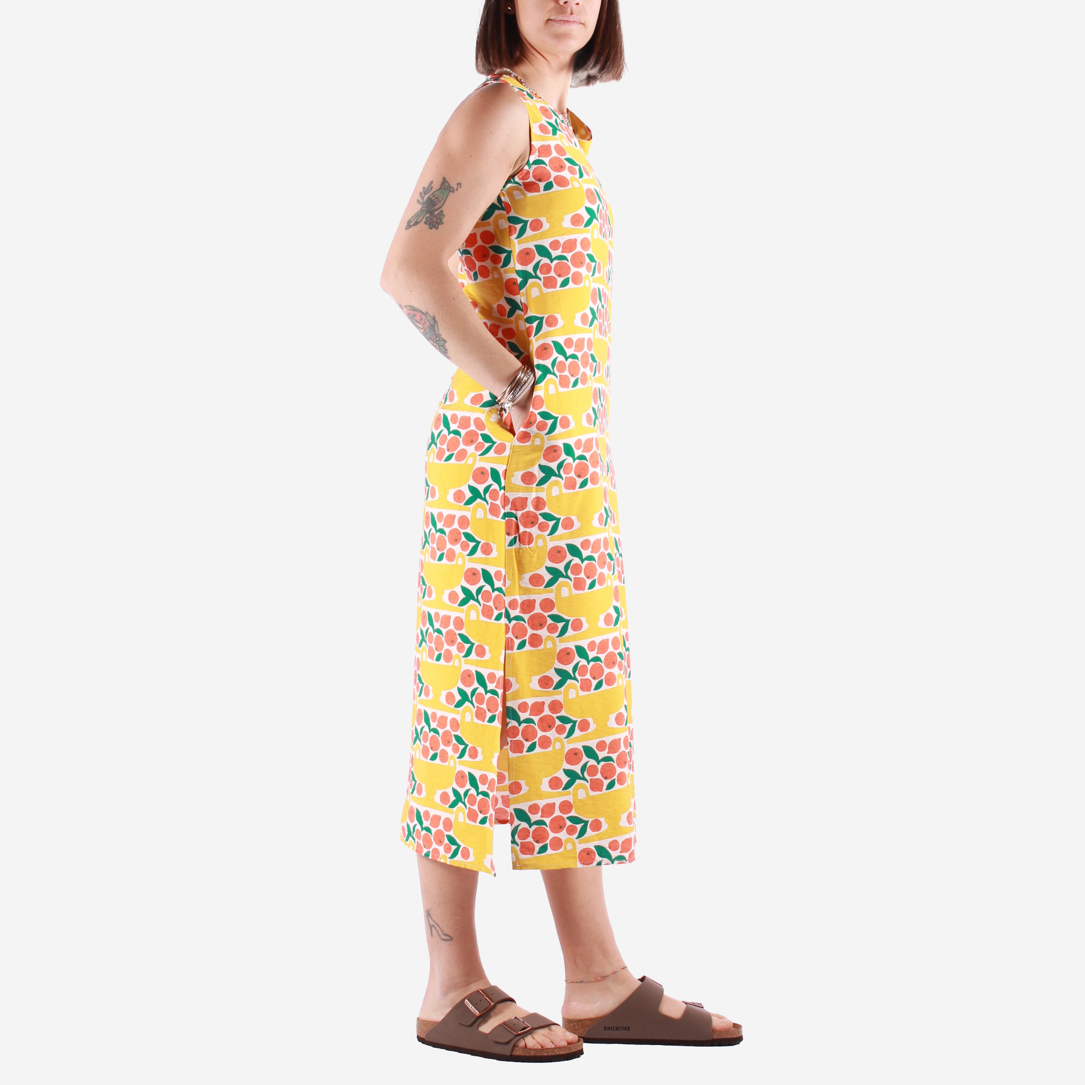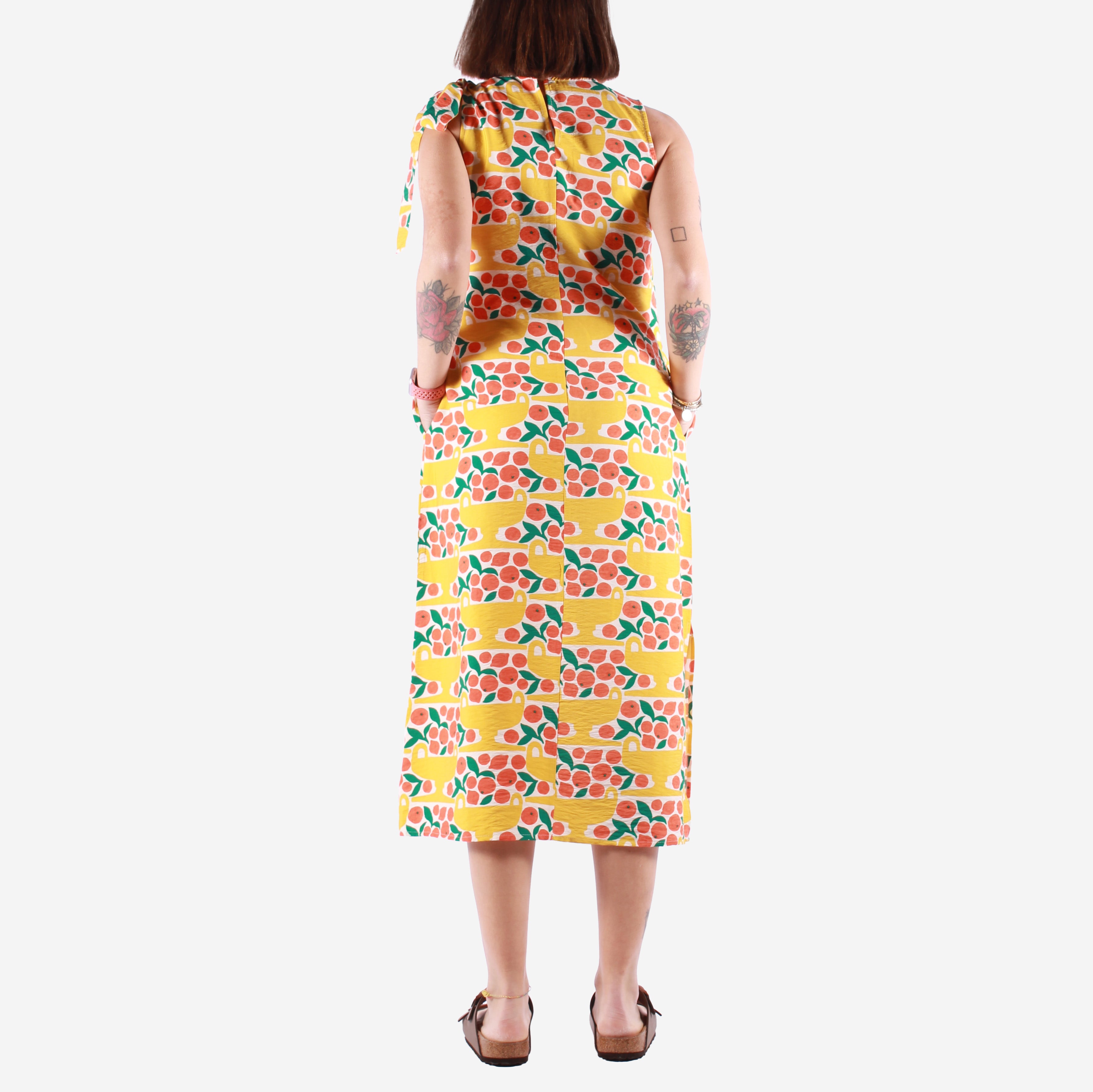 Compañía Fantástica firma questo abito lungo dal carattere fresco e vivace, perfetto per la stagione estiva. Realizzato in un leggero tessuto fluido con viscosa e poliammide, offre una vestibilità comoda e ariosa ideale per le giornate più calde. Il design senza maniche con girocollo pulito è arricchito da un originale dettaglio con fiocco su una spalla, mentre la lunghezza midi dona eleganza e praticità. La stampa grafica ispirata agli agrumi aggiunge una nota solare e giocosa che riflette lo stile creativo del brand spagnolo. Completano il modello le pratiche tasche laterali, rendendolo un capo versatile da indossare con sandali o sneakers per look estivi leggeri e pieni di personalità.