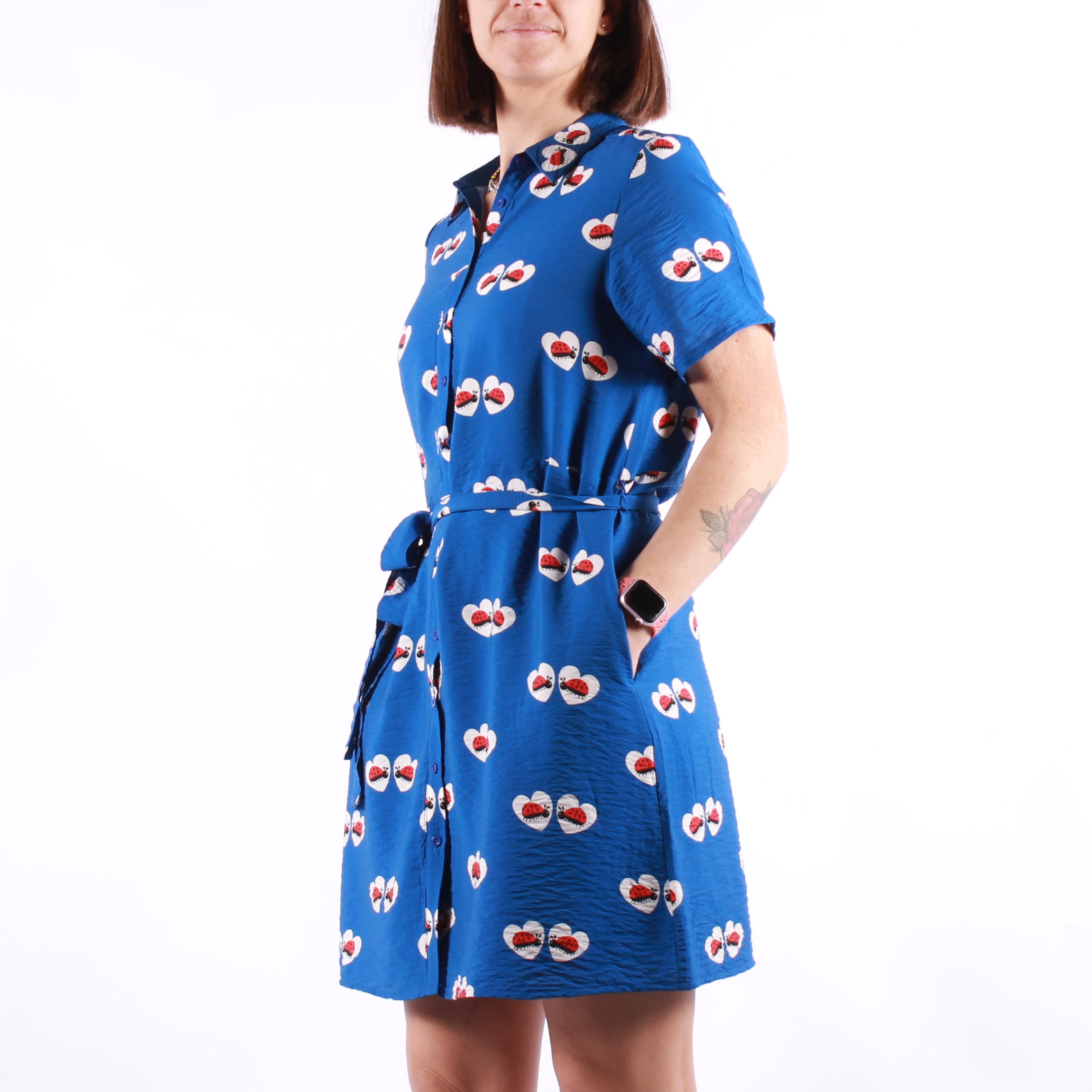 Abito corto in tessuto crêpe leggero con stampa coccinella. Collo a revers e maniche corte. Chiusura frontale con bottoni blu. Cintura in vita.