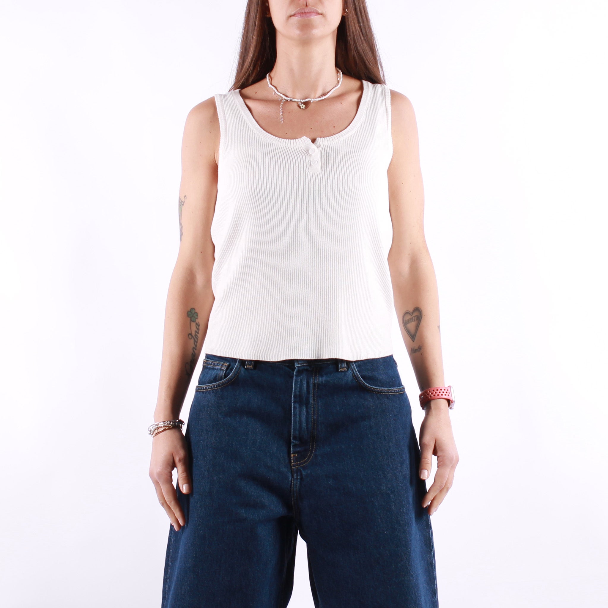 Questa canotta è realizzata in 100% poliestere, un materiale leggero e traspirante che offre comfort e versatilità. Il design senza maniche e lo scollo arrotondato con bottoncini frontali aggiungono un tocco di stile casual e femminile. Perfetta da indossare nelle giornate più calde, si abbina facilmente a jeans, gonne o shorts per un look fresco e dinamico. Ideale per un outfit quotidiano o per un'occasione informale, garantisce praticità senza rinunciare all'eleganza.