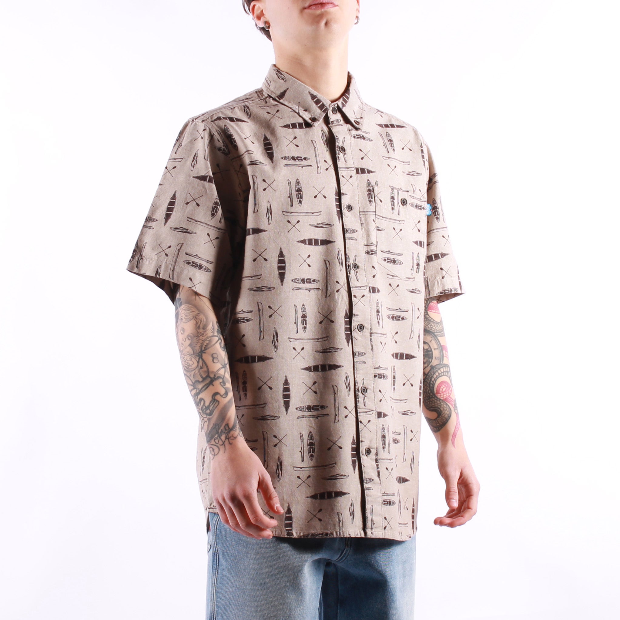 Vestibilità casual, manica corta con bottoni, colletto con bottoni e nastro jacquard con logo in poliestere riciclato, taschino singolo sul petto con chiusura a bottone, bottoni in finto legno riciclato al 25% in poliestere certificato, carré posteriore tagliato in sbieco con piega centrale posteriore, orlo curvo.